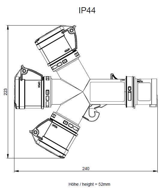 Y-vormige CEE-verdeelconnector met 3 stopcontacten 16A en 1 vaste stekker. Robuust, waterdicht en ideaal voor industriële en tijdelijke toepassingen.