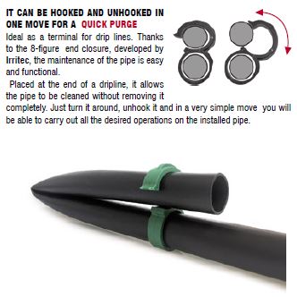 | Toepassing | Om het uiteinde van druppelslangen af te dichten, functie: het eenvoudig spoelen van druppelslangen en daarna weer dichten, i.p.v. een plug of afsluiter |