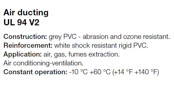 | Toepassing | Afzuigslang voor lucht, gas, rook. Airco en ventilatie toepassingen |