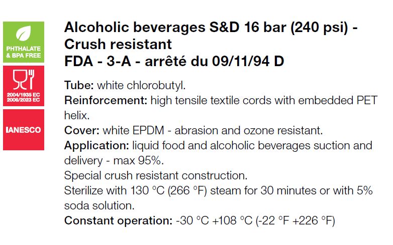 Alfagomma, Zuig -en persslang voor alcoholische dranken, Textielinlagen met ingewerkte PET spiraal - 16 bar, 25 x 37 mm - 1", afname per volle rol, 30,5 mtr., type 410LL