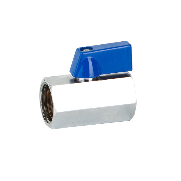 Genebre messing verchroomde mini kogelkraan, volledig zeskant, type 3396, 1/8" bi. x bi.dr., PN16, blauwe alu. handgreep