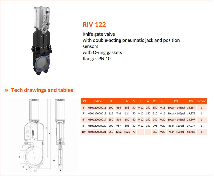 RIV Gladio 122 gietstalen / RVS 304 dubbelwerkend pneumatisch bediende plaatafsluiter, + positionering sensoren, met vierkantflenzen 10", incl. 2 O-ringen, ATEX, IMQ gecertificeerd