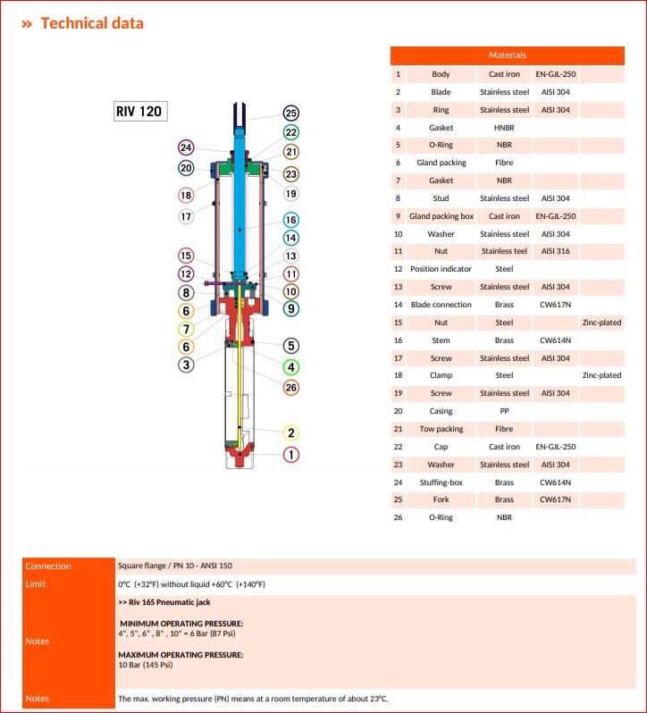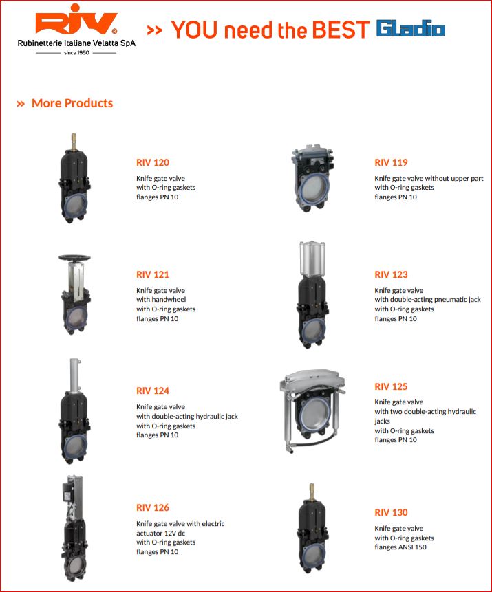 RIV levert een breed assortiment originele kwaliteit schuifafsluiters, hevel bediening armaturen, hydraulische- pneumatische enkel en dubbelwerkende cilinders, tank beveiligingen, tankvulling indicatoren, flexibele koppelingen en trechters.