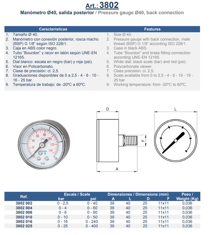 Genebre manometer, ABS behuizing, droog, diam. 40 mm, type 3802, 1/8" messing bu. dr., 0 - 2,5 bar, achteraansluiting