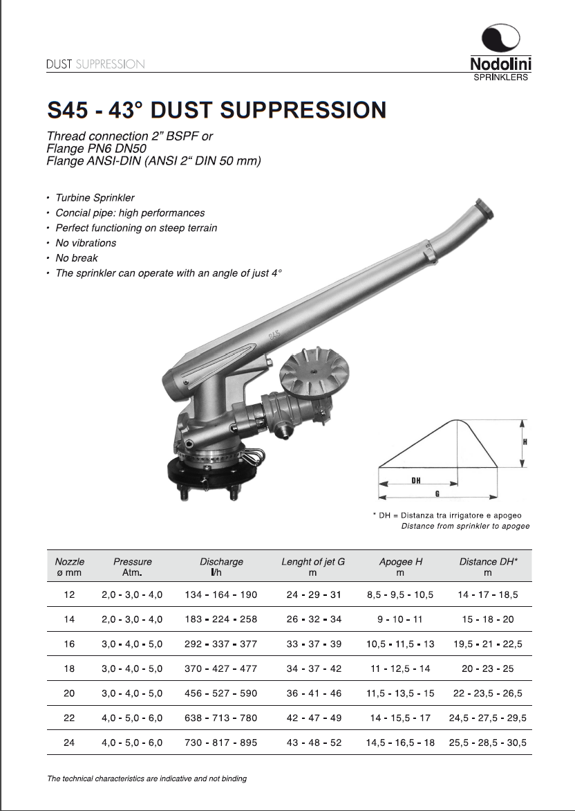 Nodolini professionele hogedruk sproeier voor industrie type S45 - 43° DUST SUPPRESSION, 0-13 graden, BSP-F bi.dr., incl. 7 nozzles