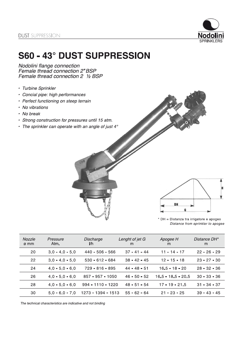 Nodolini professionele hogedruk sproeier voor industrie type S60 -43° DUST SUPPRESSION, 0-13 graden, 2" of 2 1/2" BSP-F bi.dr., incl. 6 nozzles