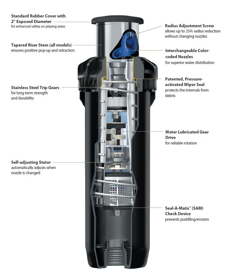 | Toepassing | Universele Pop-Up sproeiers met brede toepassing door toepassing van verschillende type's nozzles in de meest voorkomende siertuinen, parken, sportvelden en evenementen terreinen |