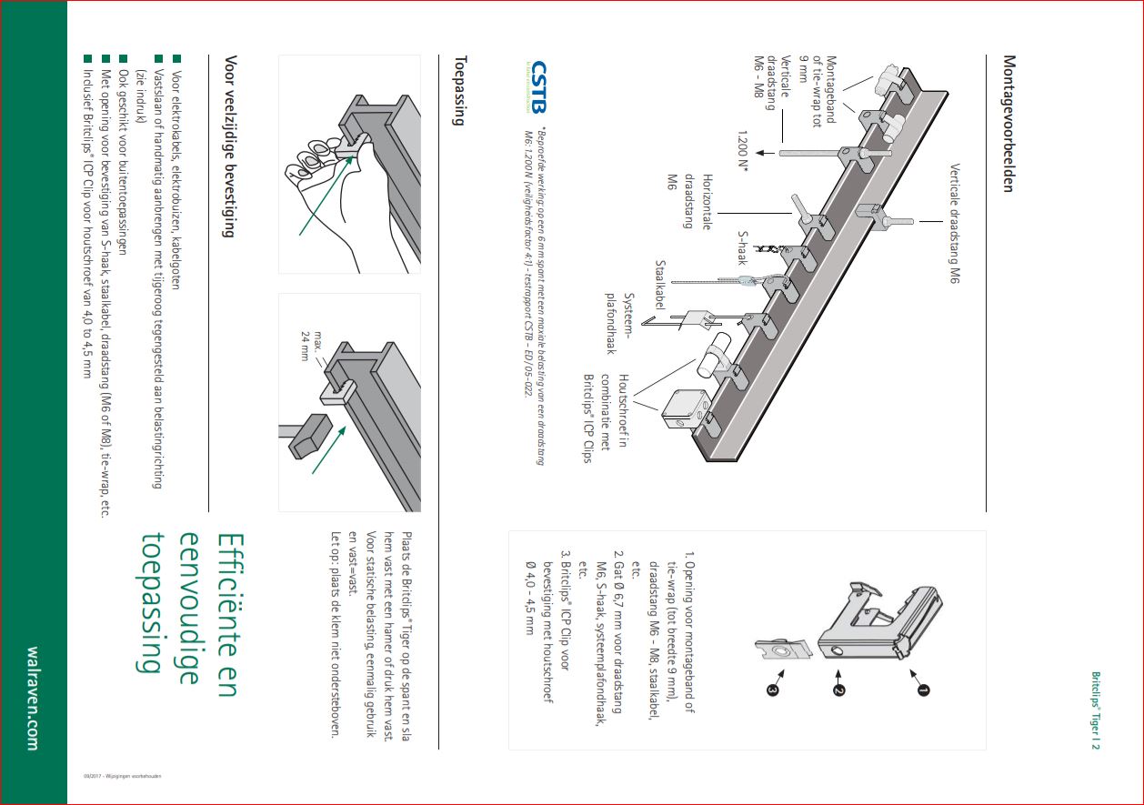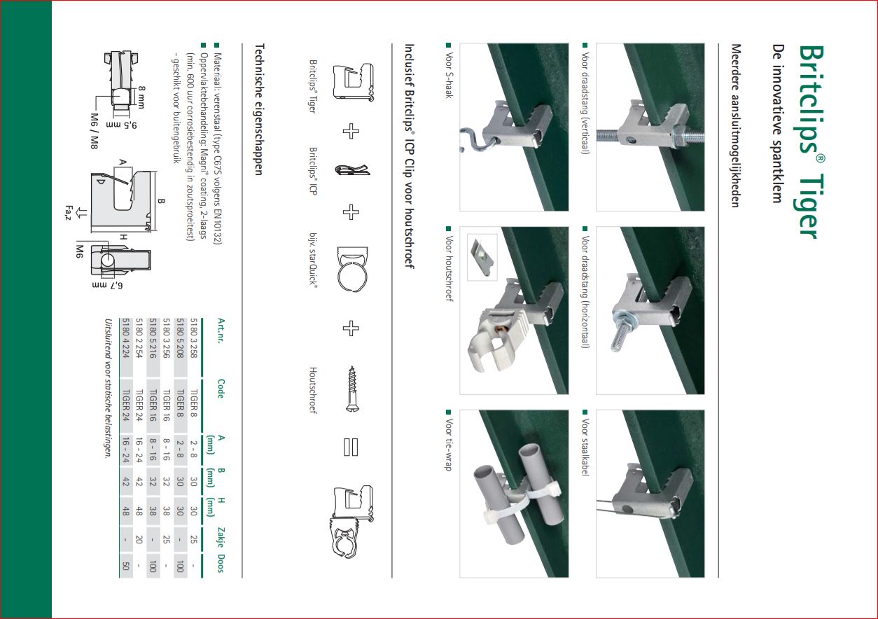 Voor flens montage van bevestigingsmaterialen Voordelen & kenmerken: * Multifunctionele klem * Voor statische belastingen, voor éénmalig gebruik (niet verschuifbaar) * Vastslaan of handmatig aanbrengen met tijgeroog tegengesteld aan belastingrichting (zie indruk) * Ook geschikt voor buitentoepassingen * Met opening voor bevestiging van S-haak, staalkabel, draadstang (M6 of M8), tie-wrap, etc. * Materiaal: verenstaal (type C67S volgens EN10132) * Oppervlaktebehandeling: Magni, 2-laags (min. 600 uur in zoutsproeitest) * Incl. Britclips® ICP, voor houtschroeven van 4,0 to 4,5 mm (zie J 50 07)[/br]