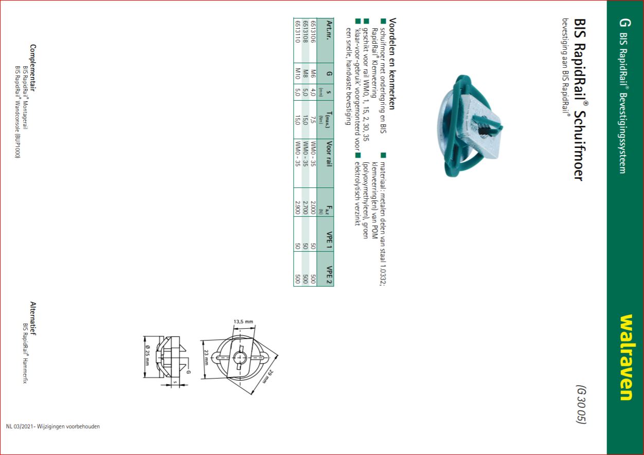Voor bevestiging aan BIS RapidRail® producten Voordelen & kenmerken: * Schuifmoer met onderlegring en BIS RapidRail® Klemveerring * Geschikt voor rail WM0, 1, 15, 2, 30, 35 * Gereed-voor-gebruik' voorgemonteerd voor een snelle, handvaste bevestiging * Materiaal: metalen delen van staal 1.0332; klemveerring(en) van POM (polyoxymethyleen), groen * Elektrolytisch verzinkt[/br]