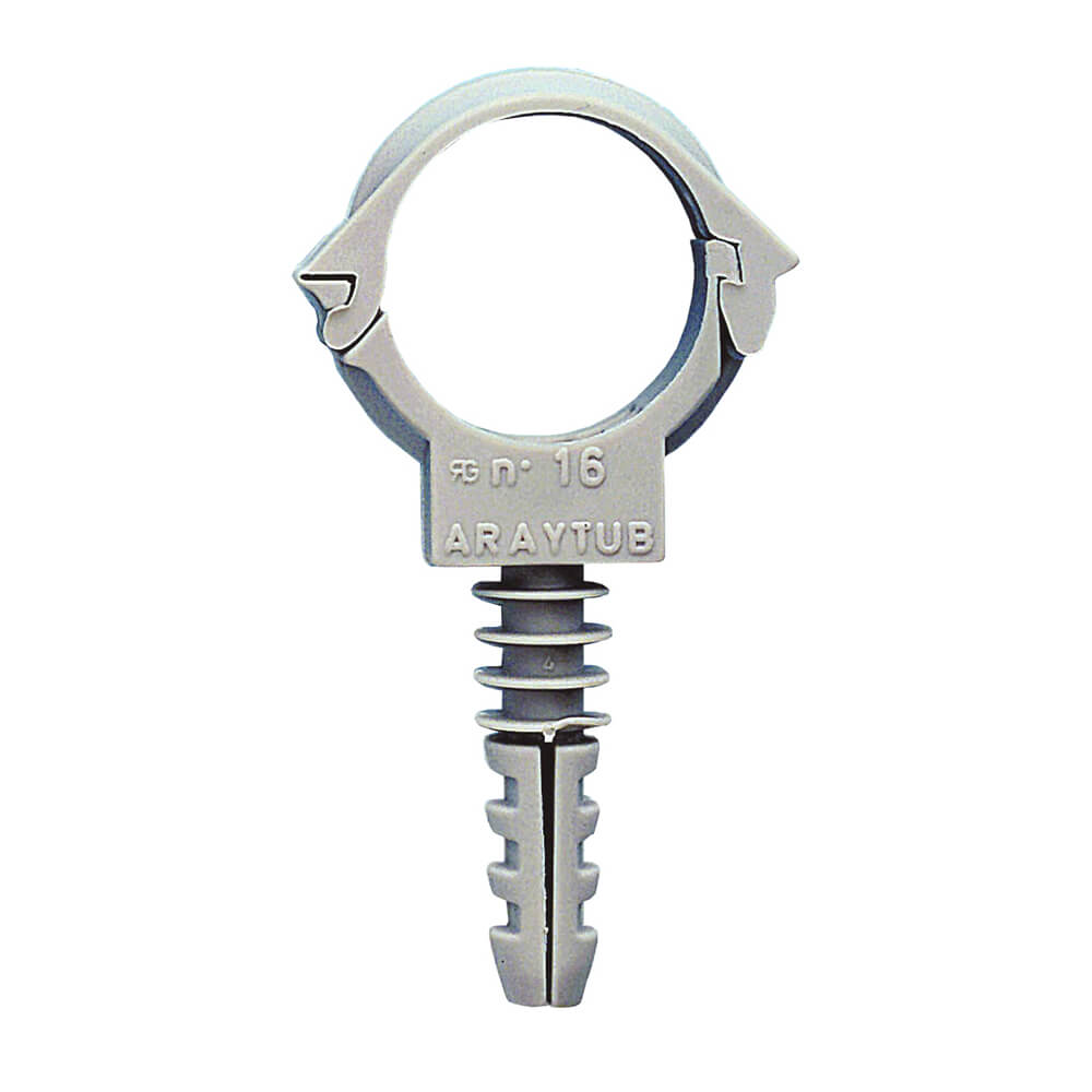 Voor alle soorten buis Voordelen & kenmerken: * Beugel met aangespoten plug * Sluiting met dubbele vertanding voor extra zekerheid * Snel en eenvoudig * Voor massieve en holle materialen * De uittrekwaarde kan verhoogd worden door het indraaien van een schroef (Ø 3,5 - 4,5 mm) of het inslaan van een spijker (belangrijk in holle materialen) materiaal: PA (polyamide), grijs[/br]
