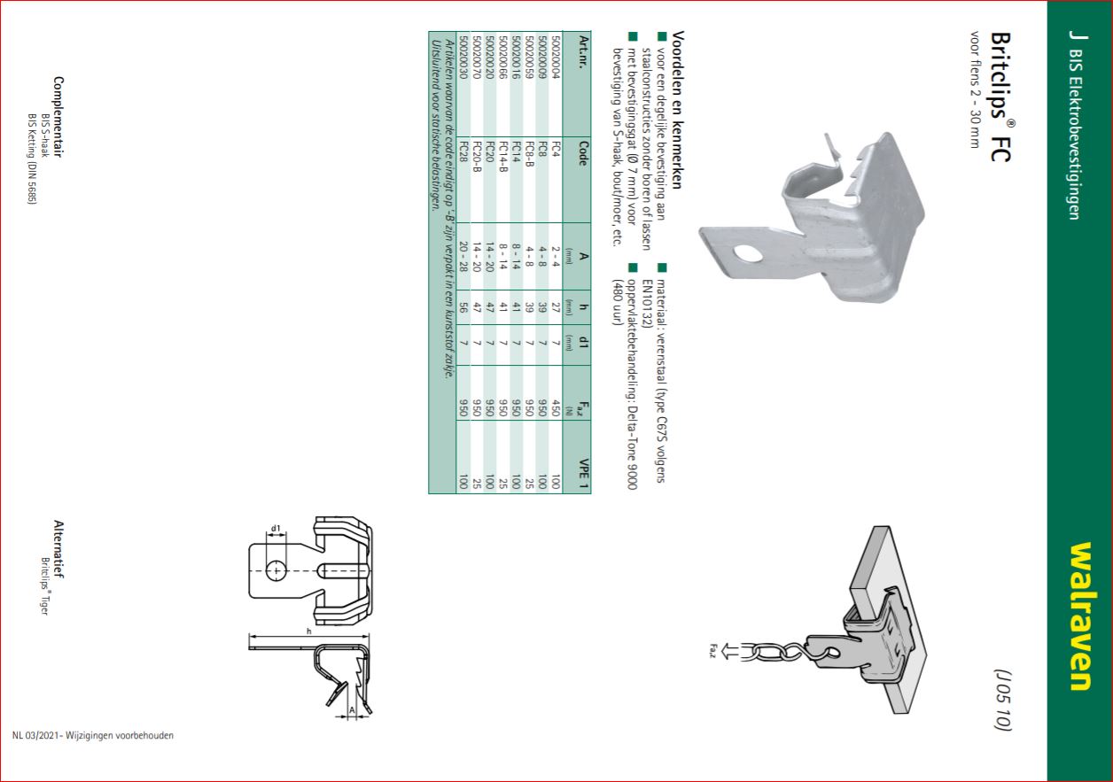 Voor flensmontage van ronde installatie buizen / kabels Voordelen & kenmerken: * Voor een degelijke bevestiging aan staalconstructies zonder boren of lassen * Met bevestigingsgat (Ø 7 mm) voor bevestiging van S-haak, bout/moer, etc. * Materiaal: verenstaal (type C67S volgens EN10132) * Oppervlaktebehandeling: Delta-Tone 9000 (480 uur)e bevestigingsmaterialen voor bouw, installatie en industriële toepassingen.[/br]