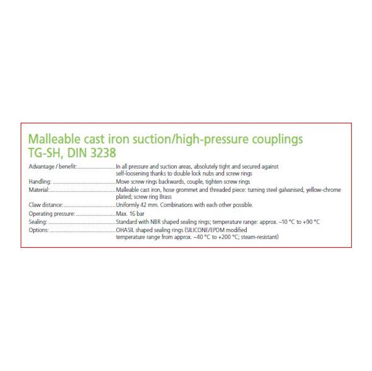 | Toepassing | Perslucht gereedschappen en installaties of fysiek zware gebruiksomstandigheden in bijv. bouw en baggerwerkzaamheden waar voor zowel perslucht als water een gietstalen koppeling gewenst is. |