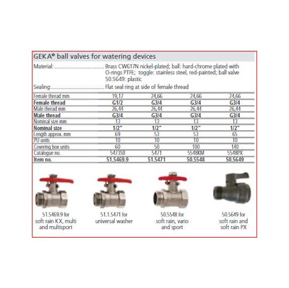 | Toepassing | Voor het bewateren van bloemen, planten, struiken, bomen, grasstroken of afkoelen van oppervlakten. Geka Plus Softrain (bajonetsluiting) en Geka Plus Classic componenten zijn onderling te combineren middels messing adapters. |