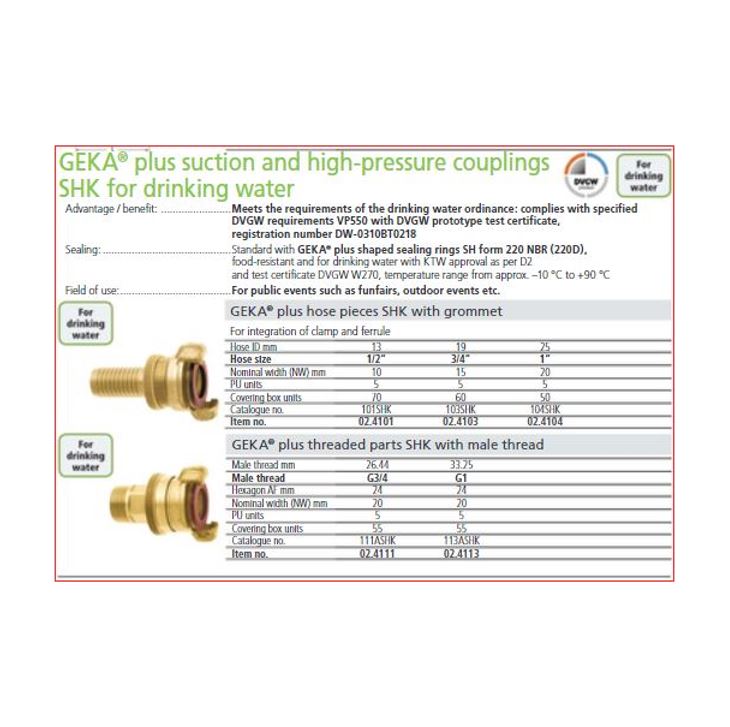 Originele messing Geka Plus snelkoppeling, serie SH-K voor drinkwater, DVGW - KTW, max. 50 bar, (zuig - pers) nastelbaar, slangtule 1" - 25 mm