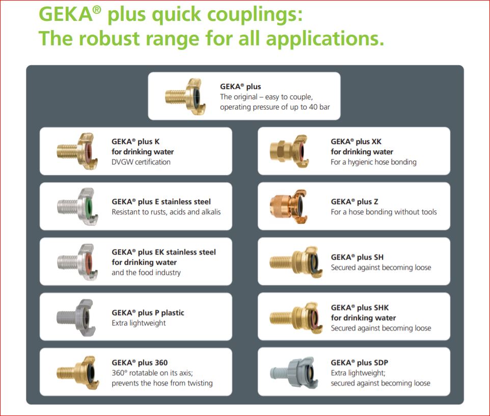 Het originele Geka assortiment omvat een complete range koppelingen, dichtingen, spuitgarnituren voor zowel professionele als hobby toepassingen.[/br]