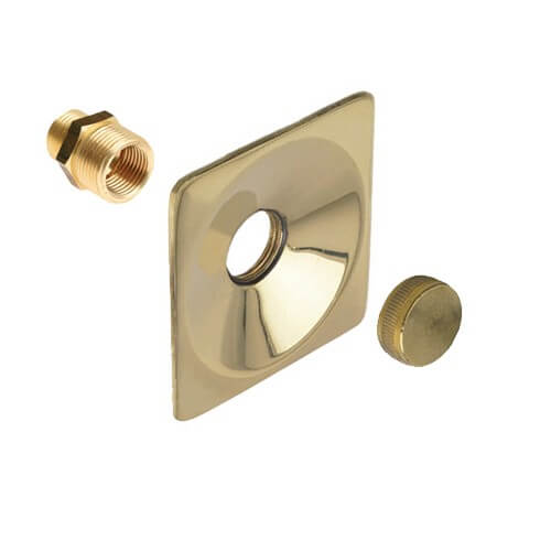 Messing vierkante gevelplaat 3/4" bi.dr. met stop en aansluitstuk t.b.v. sanitaire tapkraan, 1/2" bu.dr.