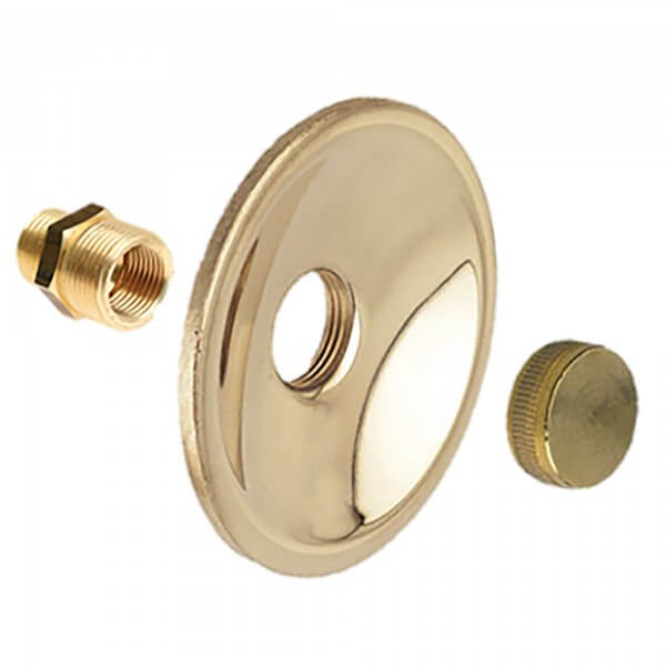 Messing ronde gevelplaat 3/4" bi.dr. met stop en aansluitstuk t.b.v. sanitaire tapkraan, 1/2" bu.dr.
