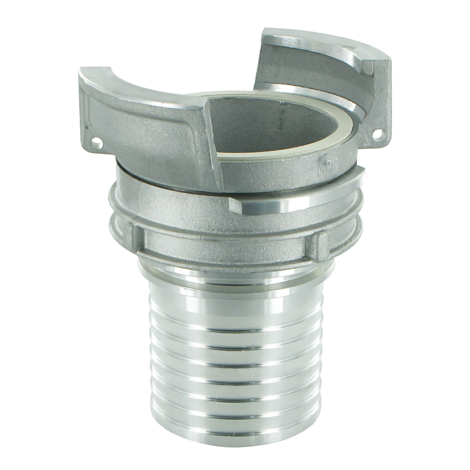 Guillemin Symmetrische draaibere half-koppeling DN100 met vergrendeling en 100 mm geribde slangtule, NBR dichting, aluminium, volgens norm NF E 29-572, EN 14420-8, 16 bar