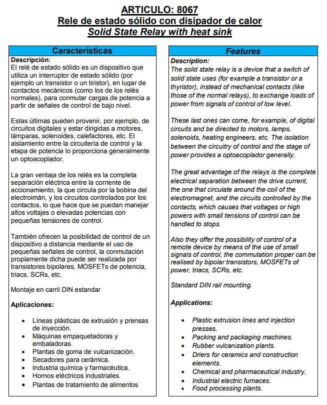 Is een apparaat dat een schakelaar uitzet, toepassingen in vaste toestand (bijvoorbeeld een transistor of een thyristor), in plaats van mechanische contacten (zoals die van de normale relais), om ladingen van uit te wisselen vermogen van signalen van controle van laag niveau.[/br]