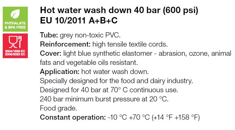 | Buitenwand slang | Synthetisch elastomeer, lichtblauw, slijtvast, ozonbestendig, resistent tegen dierenvete en plantaardige oliën |