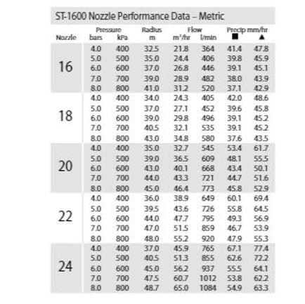 | Nozzle type ° | Zie Nozzle tabel |