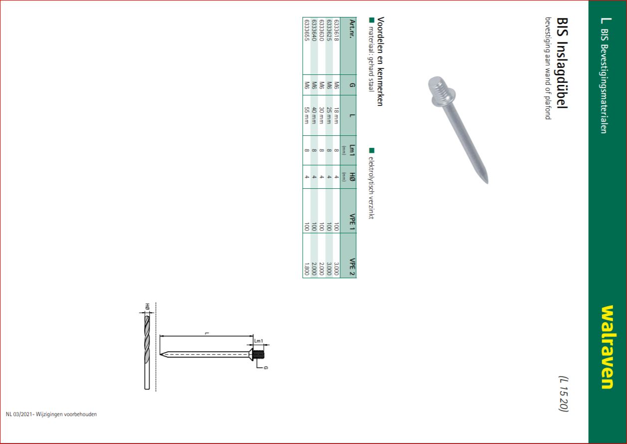 | Uitvoering | Hardstalen inslag dübel met Bu.dr. |