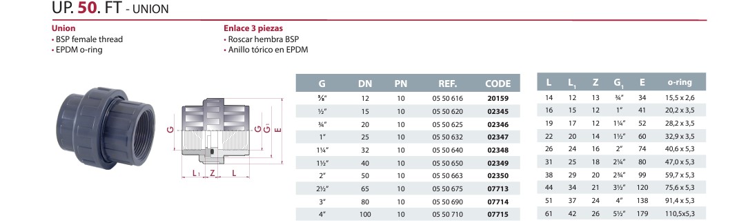 Cepex PVC-U 3-delige koppeling 50 mm x 1 1/2" bu.dr. PN16 (vp=30)