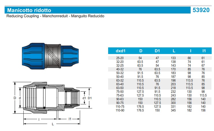 PA BLULINE PLUS PP, Drinkwater PE klemkoppeling, Recht verloop, 63 x 40 mm, 2 x klem, PN16, Kiwa, WRAS keur
