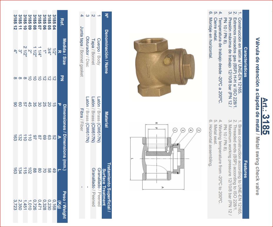 Genebre messing horizontale terugslagklep type 3185, 3", dichting metaal op metaal