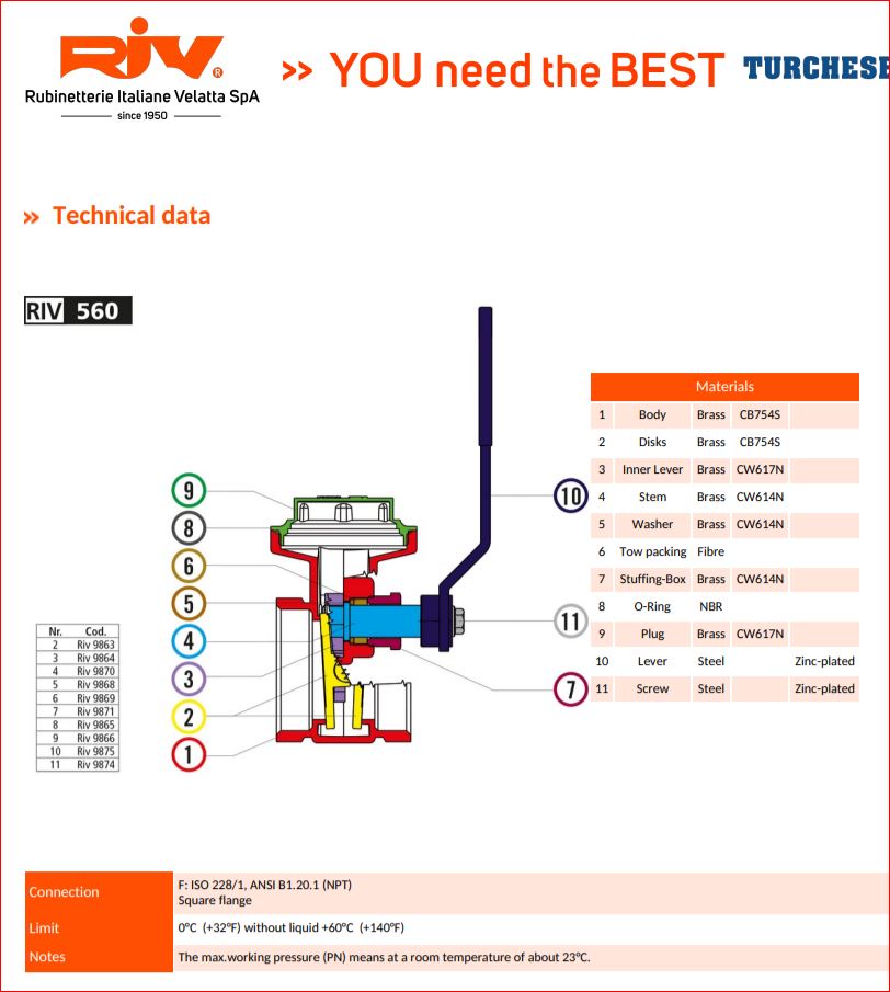 RIV Turchese 560, messing snelafsluiter, 3" bi.dr., PN10