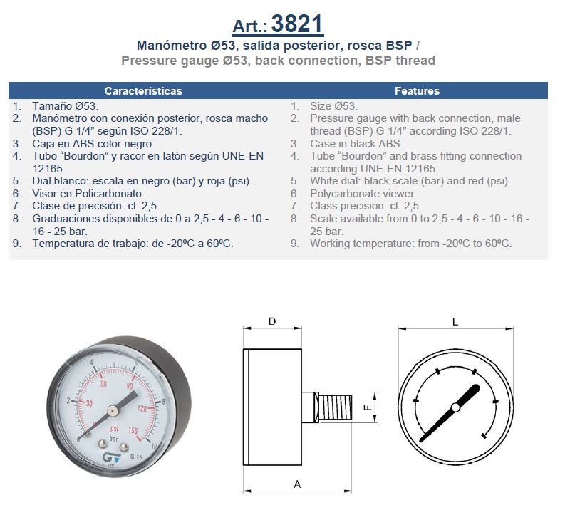 Genebre manometer, ABS behuizing, droog, diam. 53 mm, type 3821, 1/4" messing bu. dr., 0 - 2,5 bar, achteraansluiting