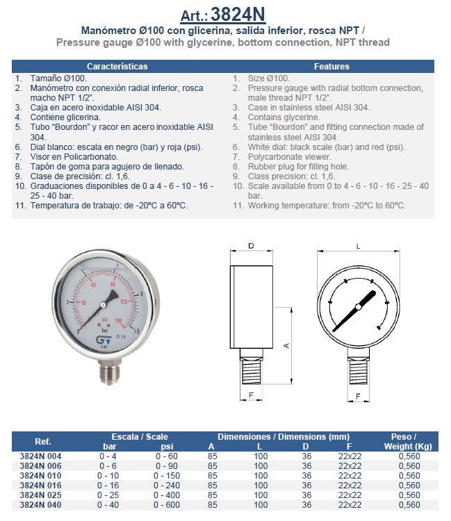 Genebre manometer, RVS 304 behuizing, glycerine gevuld, diam. 100 mm, type 3824N, 1/2" NPT RVS bu. dr., 0 - 25 bar, onderaansluiting