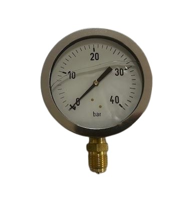 Manometer, RVS 304 behuizing, glycerine gevuld, diam. 100 mm, 1/2" Messing BSP bu. dr., 0 - +40 bar, onderaansluiting, OP = OP