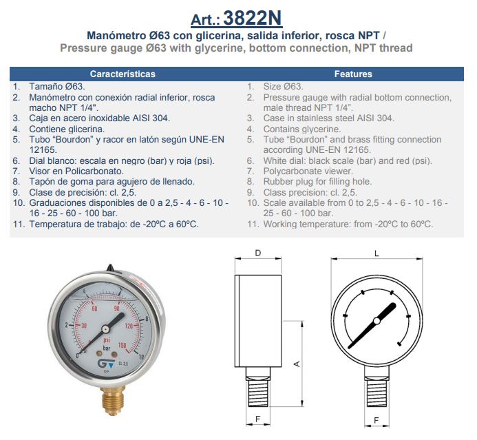 Genebre manometer, RVS 304 behuizing, glycerine gevuld, diam. 63 mm, type 3822N, 1/4" NPT messing bu. dr., 0 - 2,5 bar, onderaansluiting