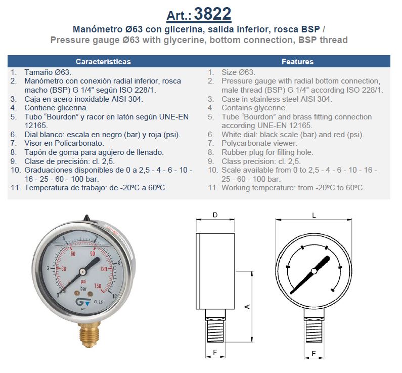 Genebre manometer, RVS 304 behuizing, glycerine gevuld, diam. 63 mm, type 3822, 1/4" messing bu. dr. 0 - 4 bar, onderaansluiting