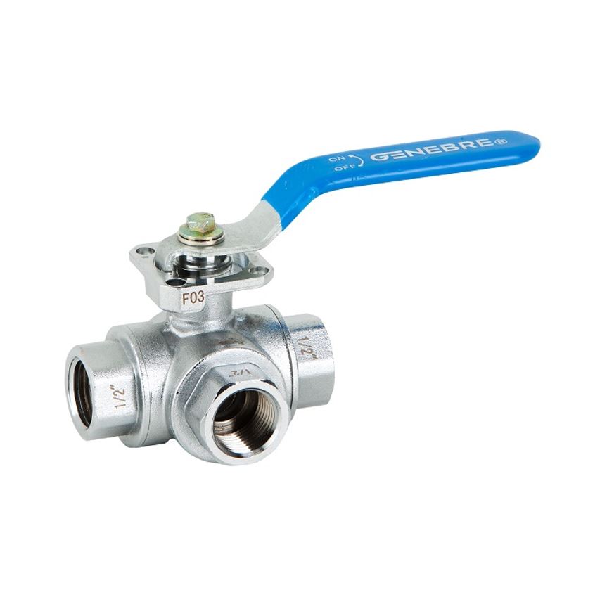 Genebre messing 3-weg kogelkraan 1/2", 3 x bi.dr., L- boring, zware uitvoering, type 3272E, volle doorlaat, PN 25, met plaatst. verchr. handgreep