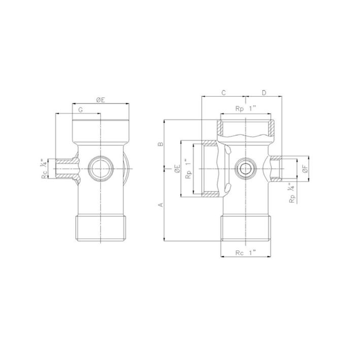 Messing 5-weg T-stuk voor hydrofoorinstall., 1/4" + 1" bi.xbu.dr., hoog 91mm