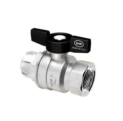 Aurea messing verchroomde kogelkraan 1 1/4", bi. x bu.dr., industrie uitvoering, type 1115, volle doorlaat, PN 28, aluminium gecoate vlinder handgreep, met ACS drinkwater certificaat