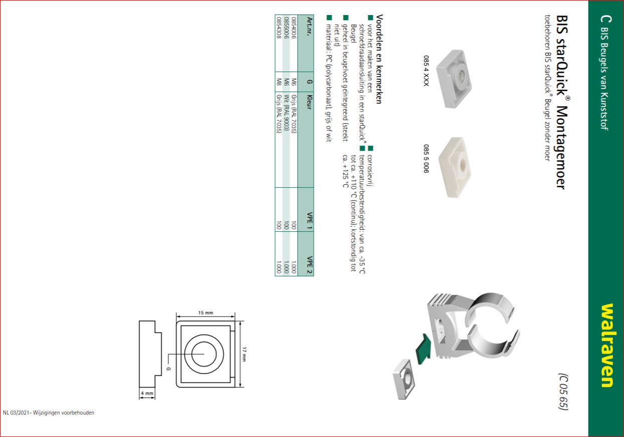 Toebehoren BIS starQuick® Beugel zonder moer Voordelen & kenmerken: * Voor het maken van een schroefdraadaansluiting in een starQuick® Beugel * Geheel in beugelvoet geïntegreerd (steekt niet uit) * Materiaal: PC (polycarbonaat), grijs of wit corrosievrij * Temperatuurbestendigheid: van ca. -35 °C tot ca. +110 °C (continu); kortstondig tot ca. +125 °C[/br]