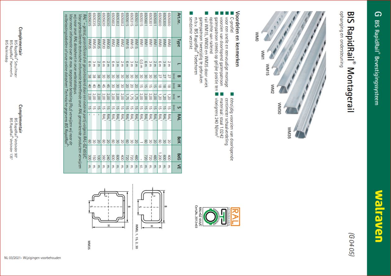 Voor ophanging en ondersteuning Voordelen & kenmerken: * C-profiel * Voor een snelle en eenvoudige montage * Voorzien van doorlopend gatenpatroon * Gatenpatroon steeds op gelijke positie ten opzichte van raileind * Eenzijdig voorzien van doorlopende centimeter schaalverdeling * Materiaal: staal 1.0242 * Vloeigrens 240 N/mm2 * Sendzimir verzinkt * Voor meer informatie over de max. toegestane belasting (Fa,z) verwijzen wij naar de railbelastingstabellen of onze online datasheet ‘Technische gegevens BIS RapidRail®[/br]