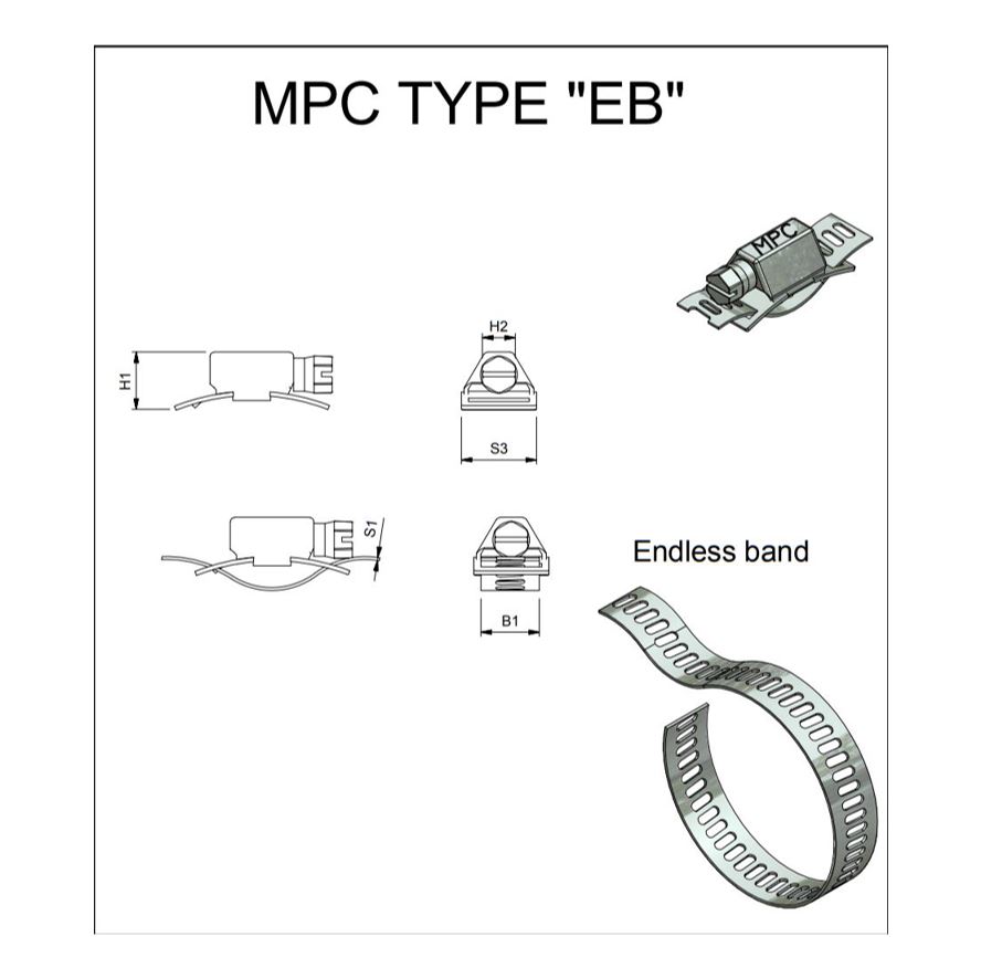 Universele MPC universeel slangklemband op rol vervaardigd uit RVS 304 W2. In het werk op maat te maken, max. te maken diam. 7,9 meter. De slangklembanden zijn leverbaar in de bandbreedte 8 en 14 mm. Standaard leverbaar RVS 304 W2, RVS 316 W4 op aanvraag. Bij gebruik van de slangklemband zijn losse wormschroefhuizen benodigd. De wormschroefhuizen zijn vervaardigd uit RVS 304 W2 met verzinkte schroef om het zelfsmerend effect van de worm te vergoten.