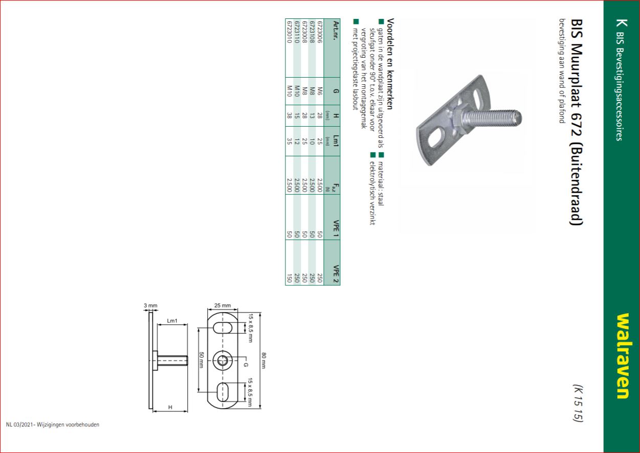 Voor bevestiging aan wand of plafond Voordelen & kenmerken: * Gaten in de wandplaat zijn uitgevoerd als sleufgat onder 90° t.o.v. elkaar voor vergroting van het montagegemak * Met projectiegelaste lasbout * Materiaal: staal * Elektrolytisch verzinkt bevestigingsmaterialen voor bouw, installatie en industriële toepassingen.[/br]