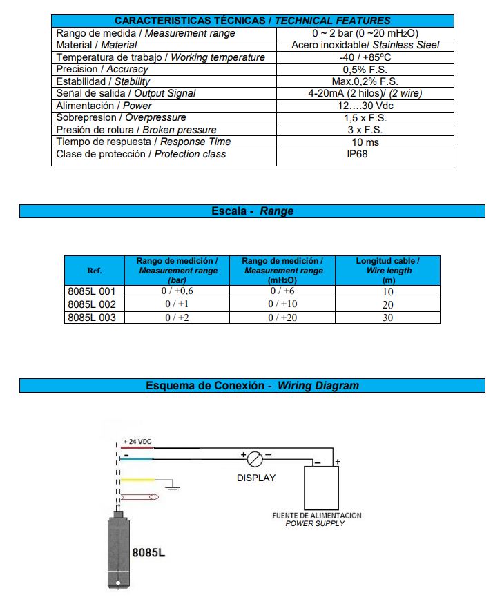 | Uitvoering | 12 - 30VDC, 4-20mA, IP68 |