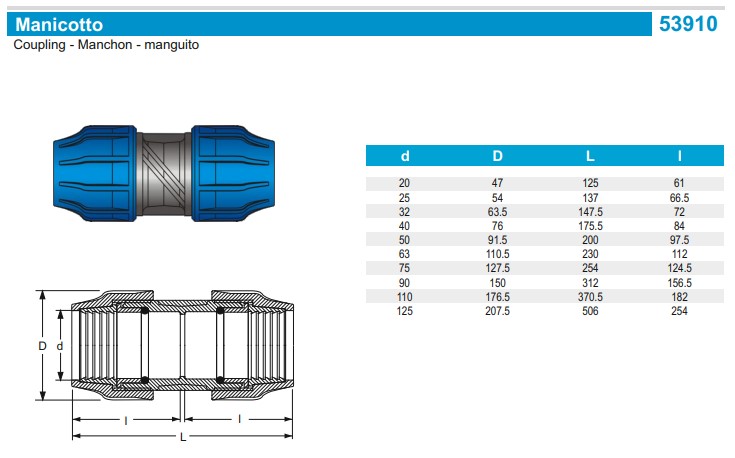 PA BLULINE PLUS PP, Drinkwater PE klemkoppeling, Recht, 63 x 63 mm, 2 x klem, PN16, Kiwa, WRAS keur