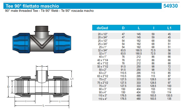 PA BLULINE PLUS PP, Drinkwater PE klemkoppeling, T-stuk 90°, 90 x 4" x 90 mm mm, 2 x klem x 1 x BSP bu.dr., PN16, Kiwa, WRAS keur