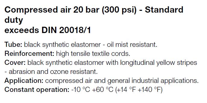 | Buitenwand slang | Zwart, synthetisch elastomeer met gele lengtestreep, slijtvast en ozonbestendig |