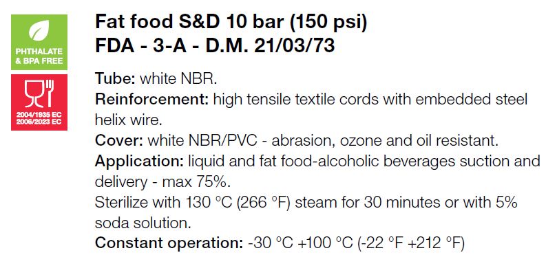 | Toepassing | Persslang en alcoholische dranken (tot 75%) . Steriliseerbaar tot 130°C voor max 30 min |