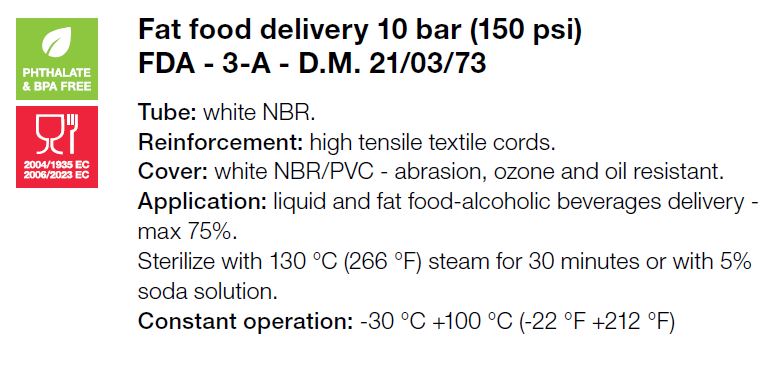 | Toepassing | Persslang en alcoholische dranken (tot 75%) . Steriliseerbaar tot 130°C voor max 30 min |