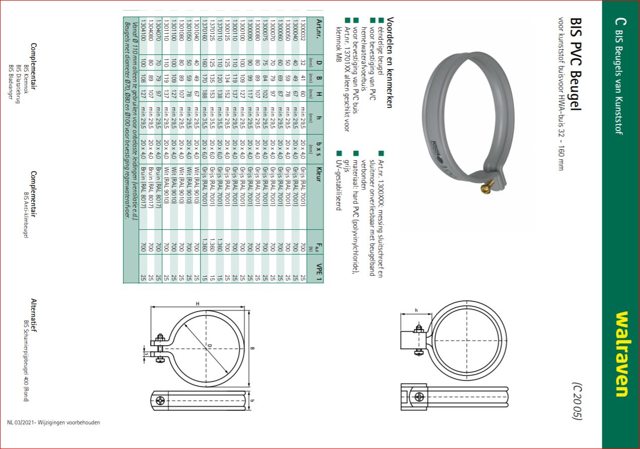 Voor HWA-buis Voordelen & kenmerken: * Eendelige beugel * Voor bevestiging van PVC hemelwaterafvoerbuis * Voor bevestiging van PVC buis * Art.nr. 13701XX alleen geschikt voor klemnok M8 * Art.nr. 1300XXX: messing sluitschroef en sluitmoer onverliesbaar met beugelband verbonden * Materiaal: hard PVC (polyvinylchloride), grijs * UV-gestabiliseerd[/br]