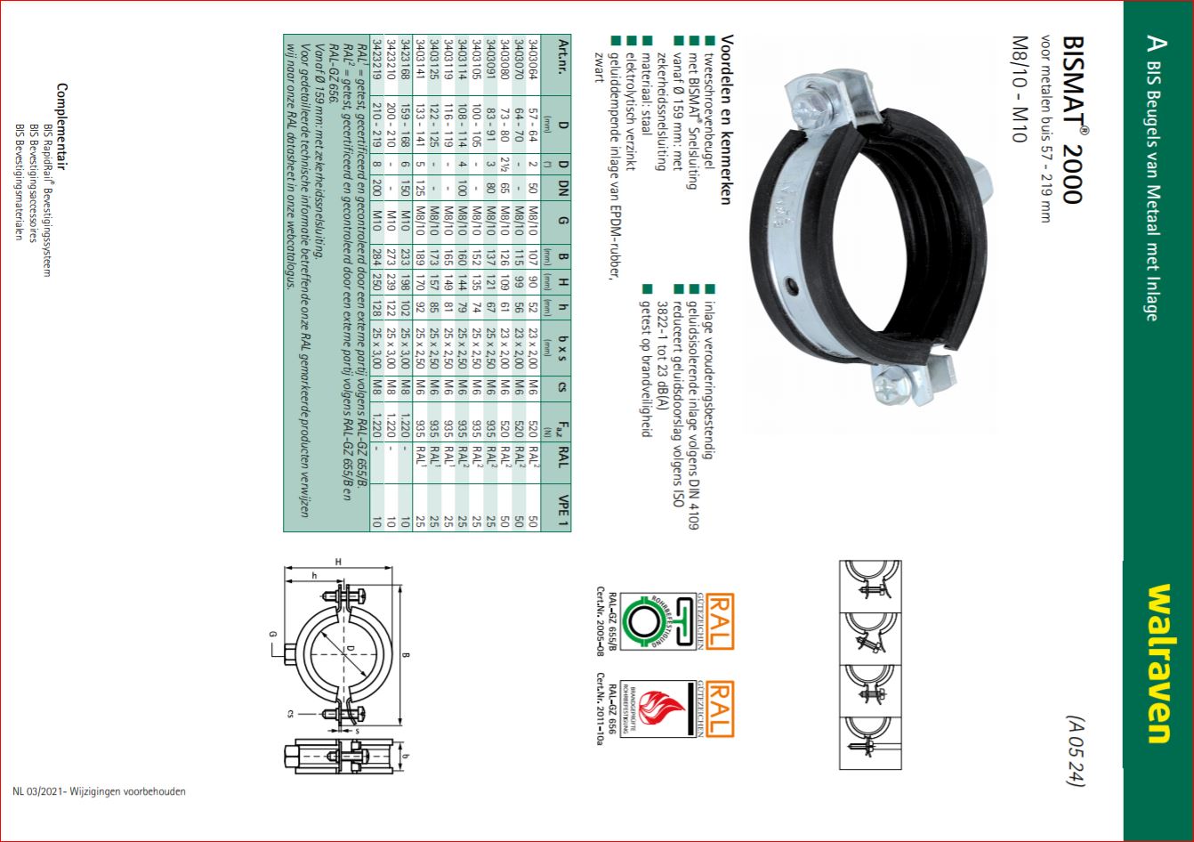 Voor metalen buis Voordelen & kenmerken: * Tweeschroevenbeugel * Met BISMAT® snelsluiting * Vanaf Ø 159 mm: met zekerheidssnelsluiting * Materiaal: staal * Elektrolytisch verzinkt * Geluiddempende inlage van EPDM-rubber, zwart * Inlage verouderingsbestendig * Geluidsisolerende inlage volgens DIN 4109 * Reduceert geluidsdoorslag volgens ISO 3822-1 tot 23 dB(A) * Getest op brandveiligheid[/br]
